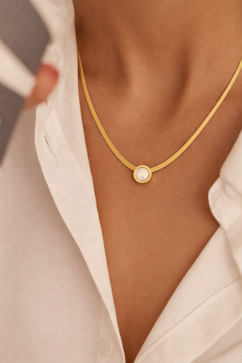 A refined gold necklace designed with a sleek flat chain and a luminous mother-of-pearl pendant at its center.