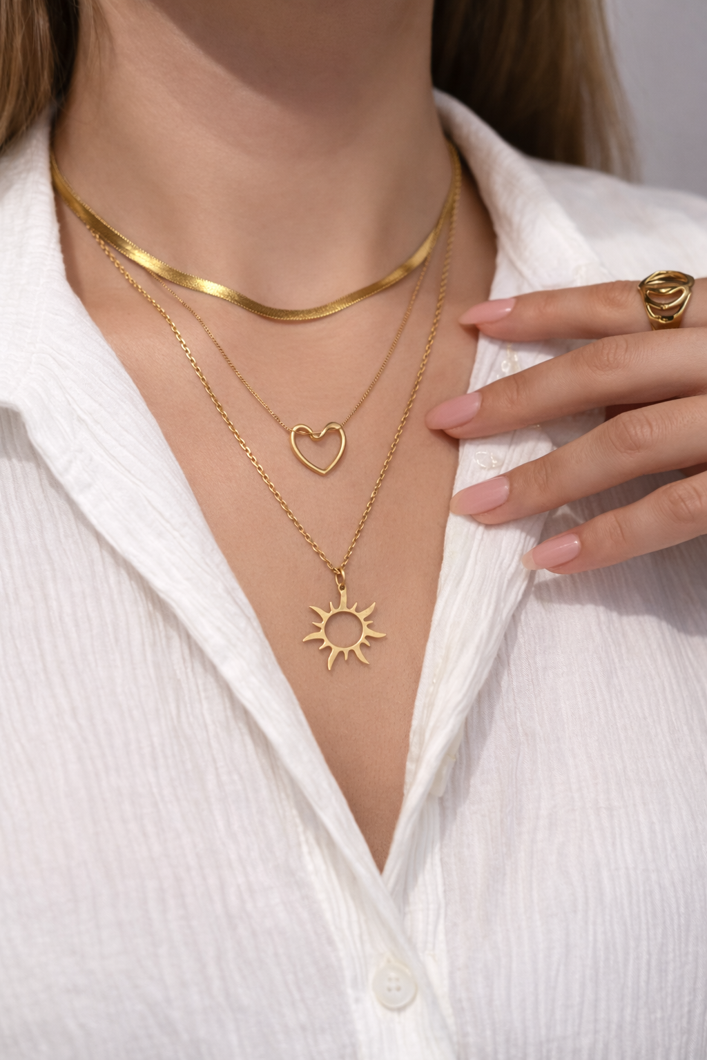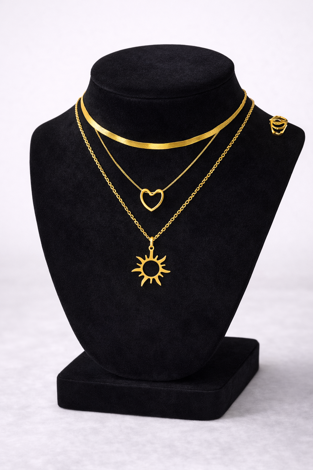 A radiant layered gold necklace set inspired by warmth, love, and effortless elegance.