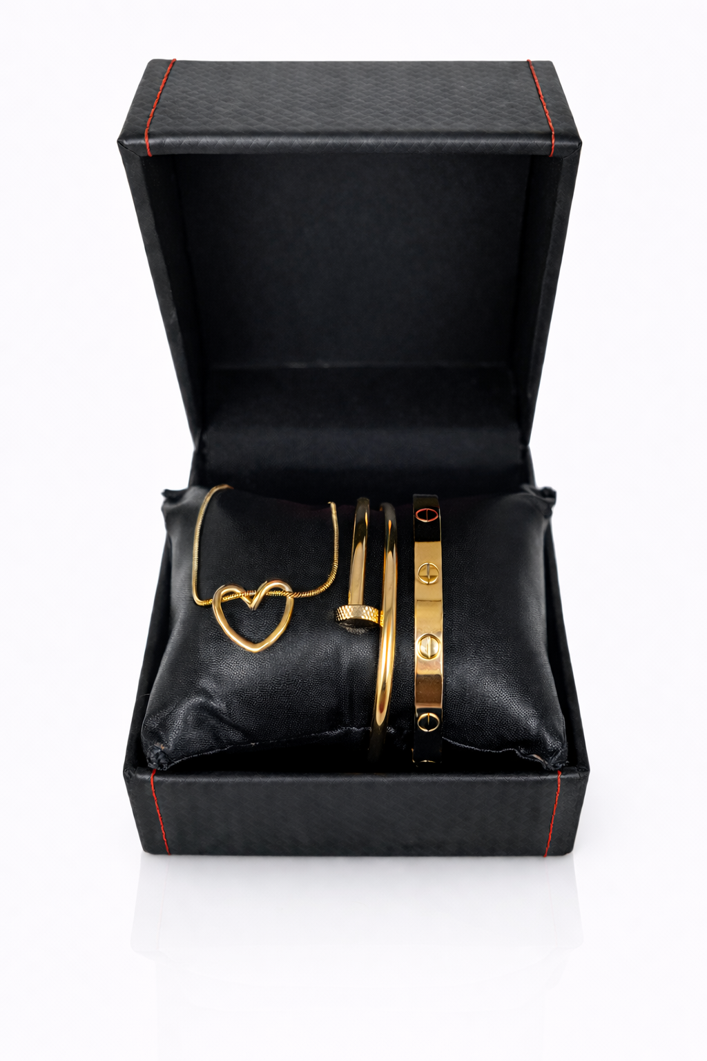 An elegant gold bracelet set inspired by timeless luxury designs. This set features a mix of minimalist and bold elements, including a sleek heart necklace and classic gold bangles, making it perfect for everyday wear or effortless layering.