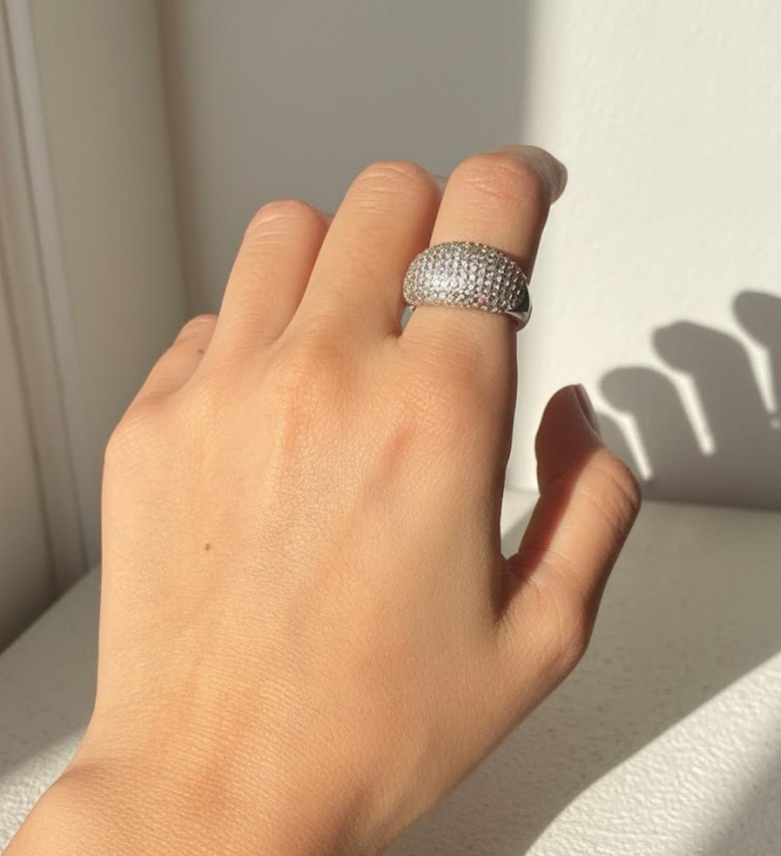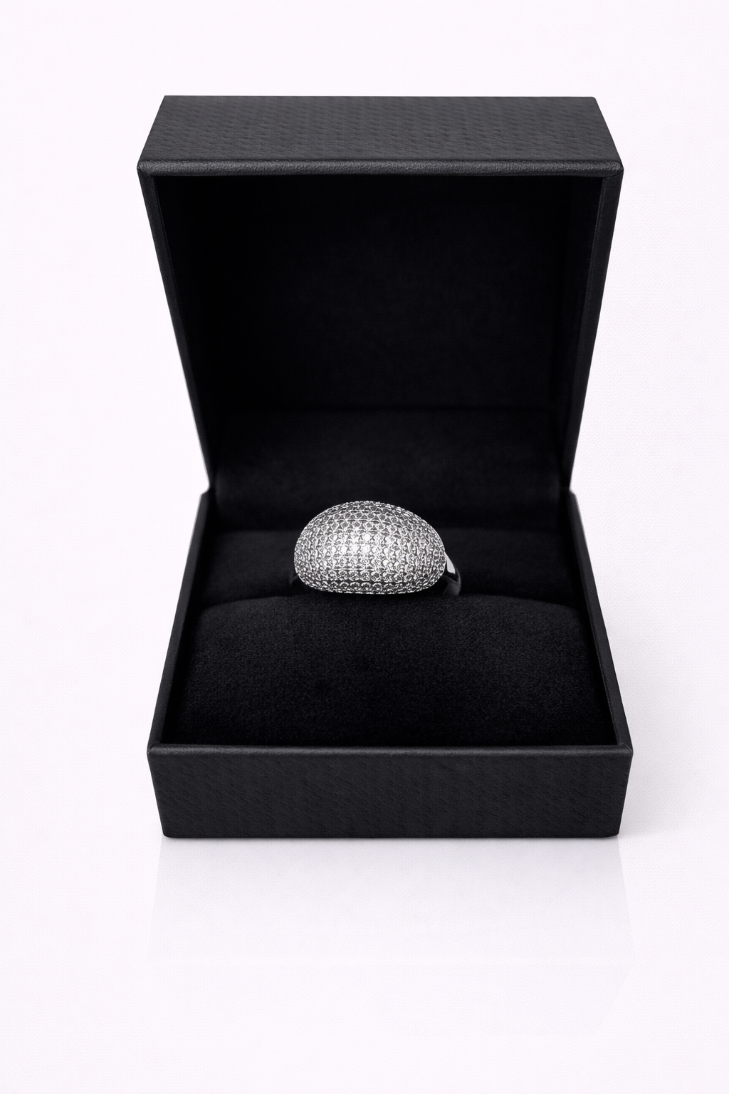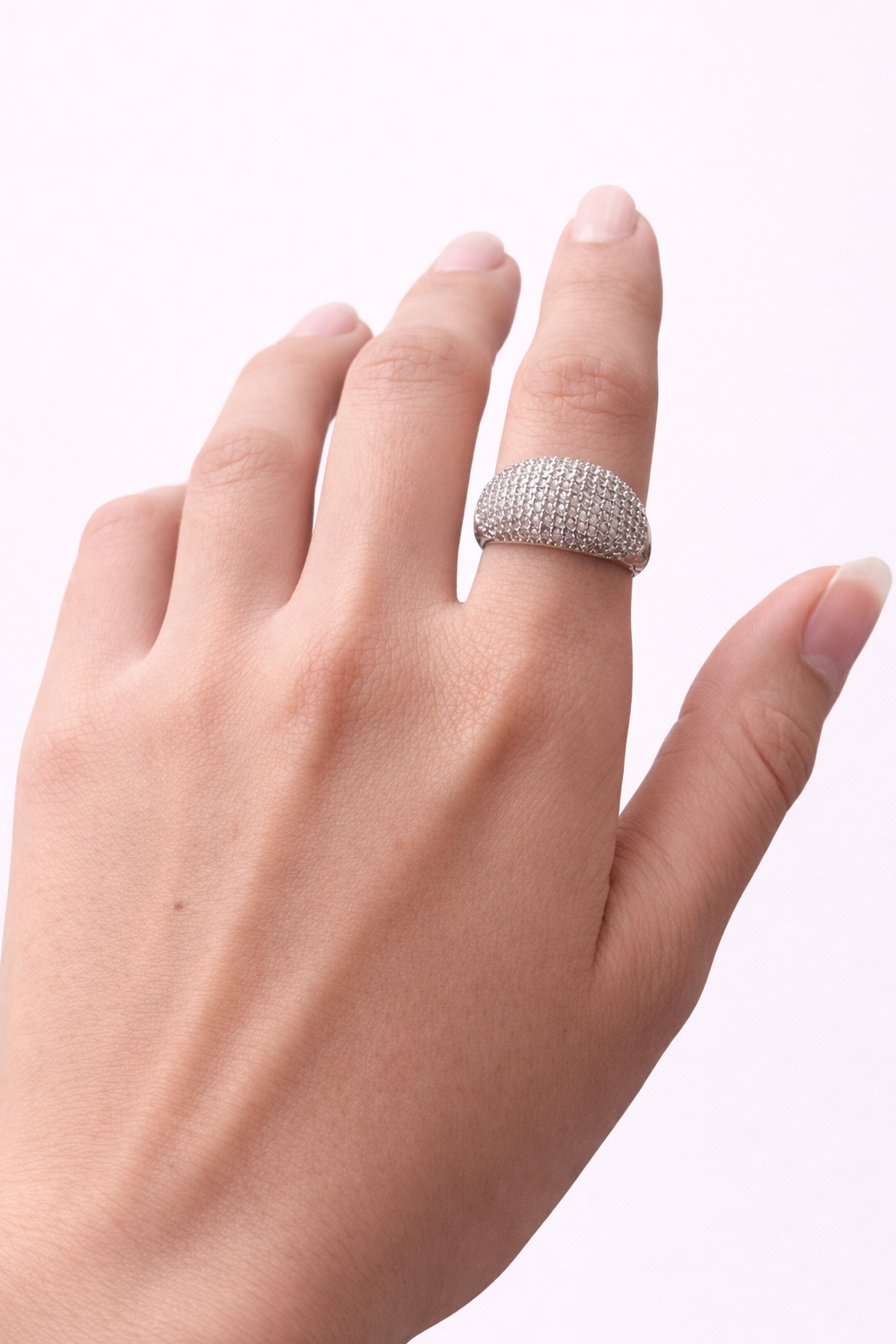 A bold and elegant silver pavé band ring designed to add instant sparkle to your look. Featuring a fully textured surface with shimmering details, this ring delivers a modern, confident style that stands out beautifully.