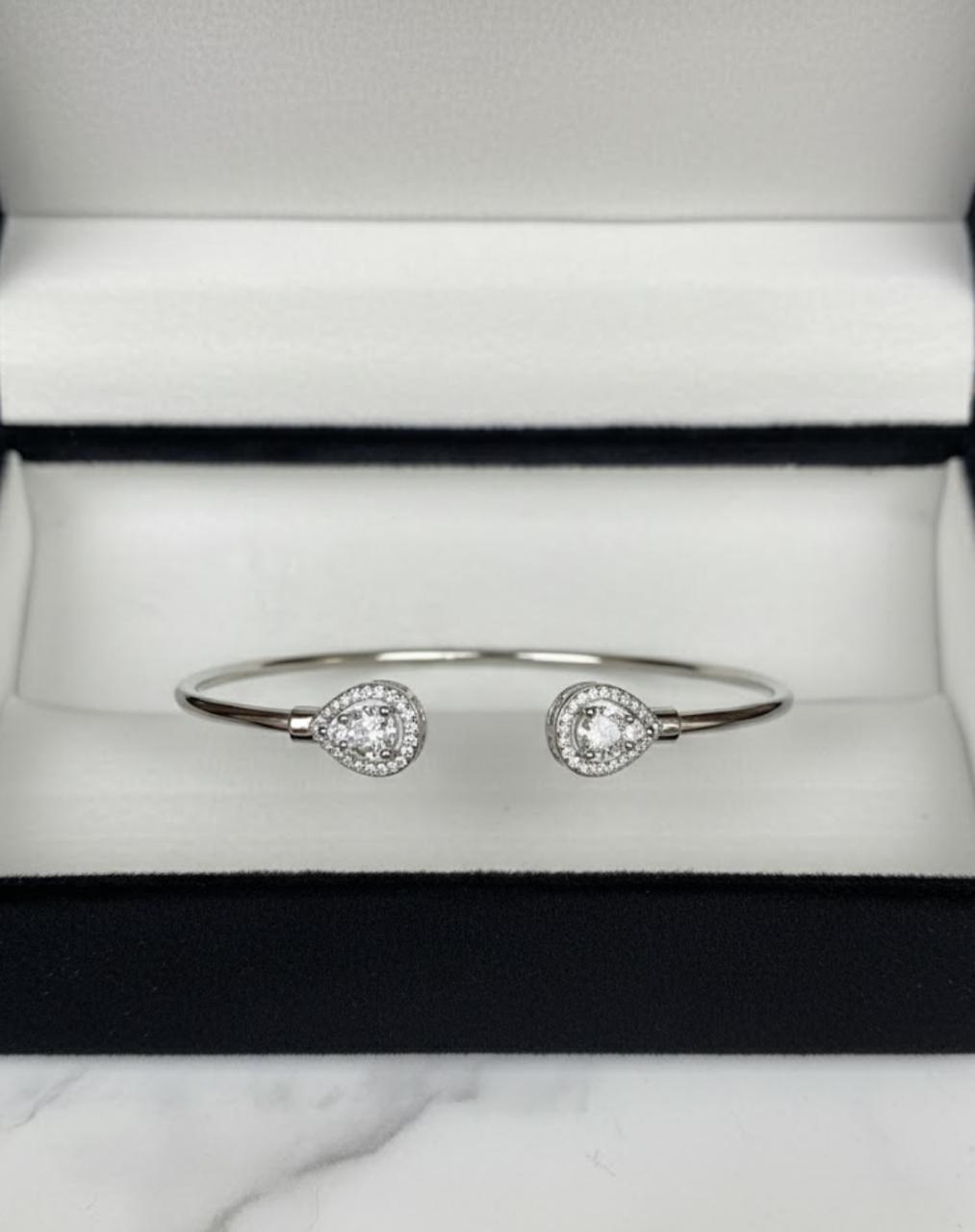 An elegant open bangle bracelet featuring delicate teardrop-shaped ends adorned with sparkling details. Designed with a sleek and modern silhouette, this bracelet adds a refined touch of shine to any look.